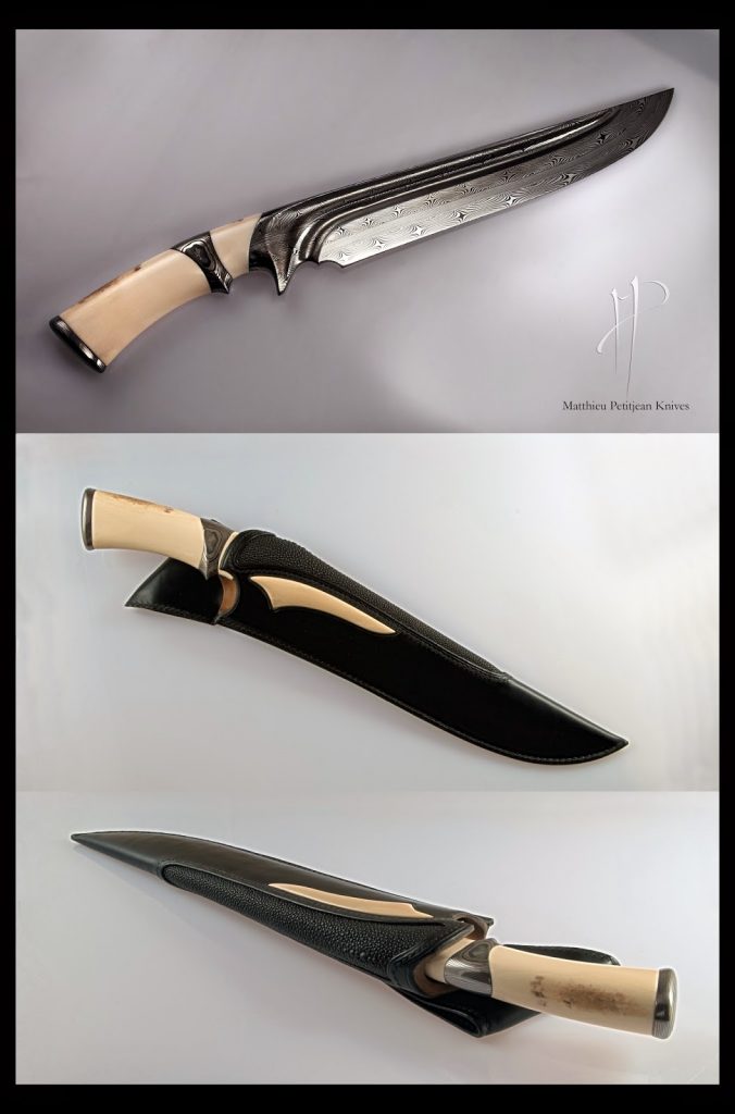 Ermine Couteau en damas, ivoire de mammouth.Fourreau en noyer gainé de cuir et galuchat, insert en ivoire de mammouth.