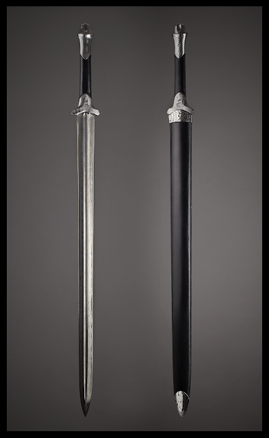 Épée, fourreau et écrin en damas, noyer et cuir.